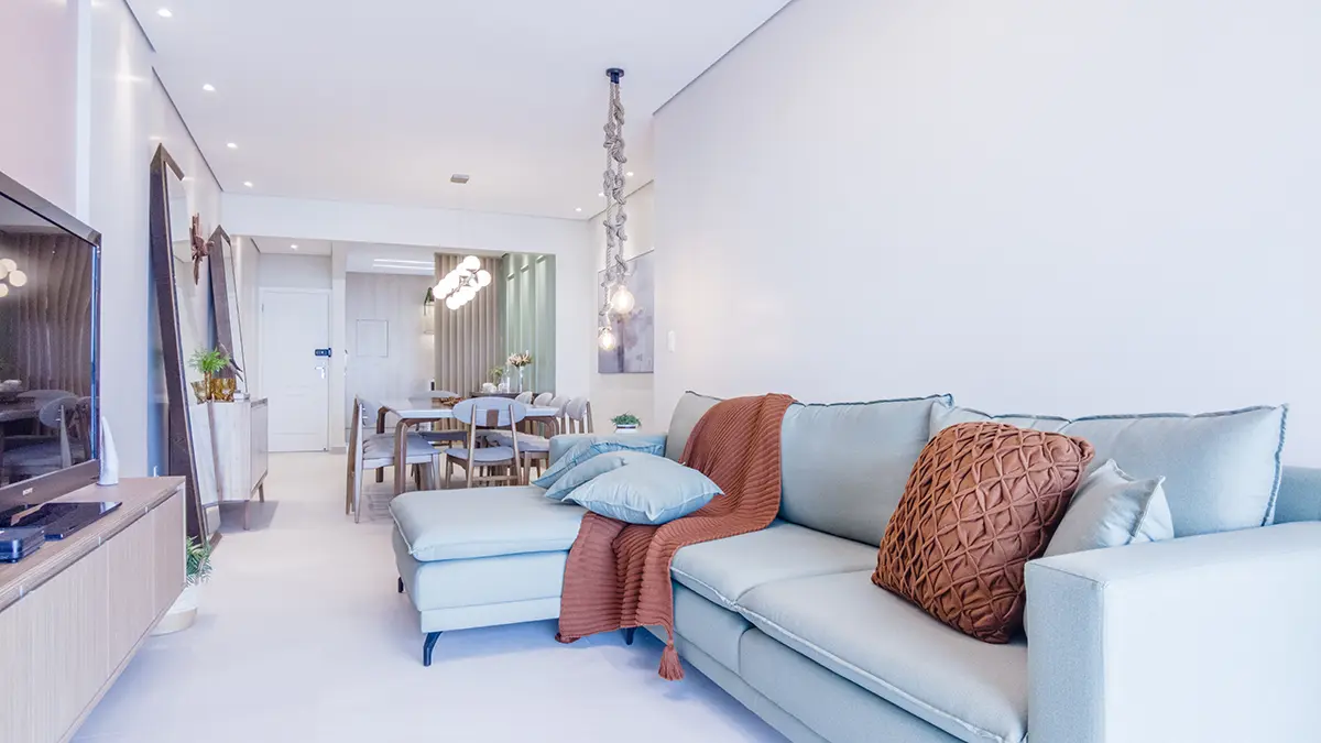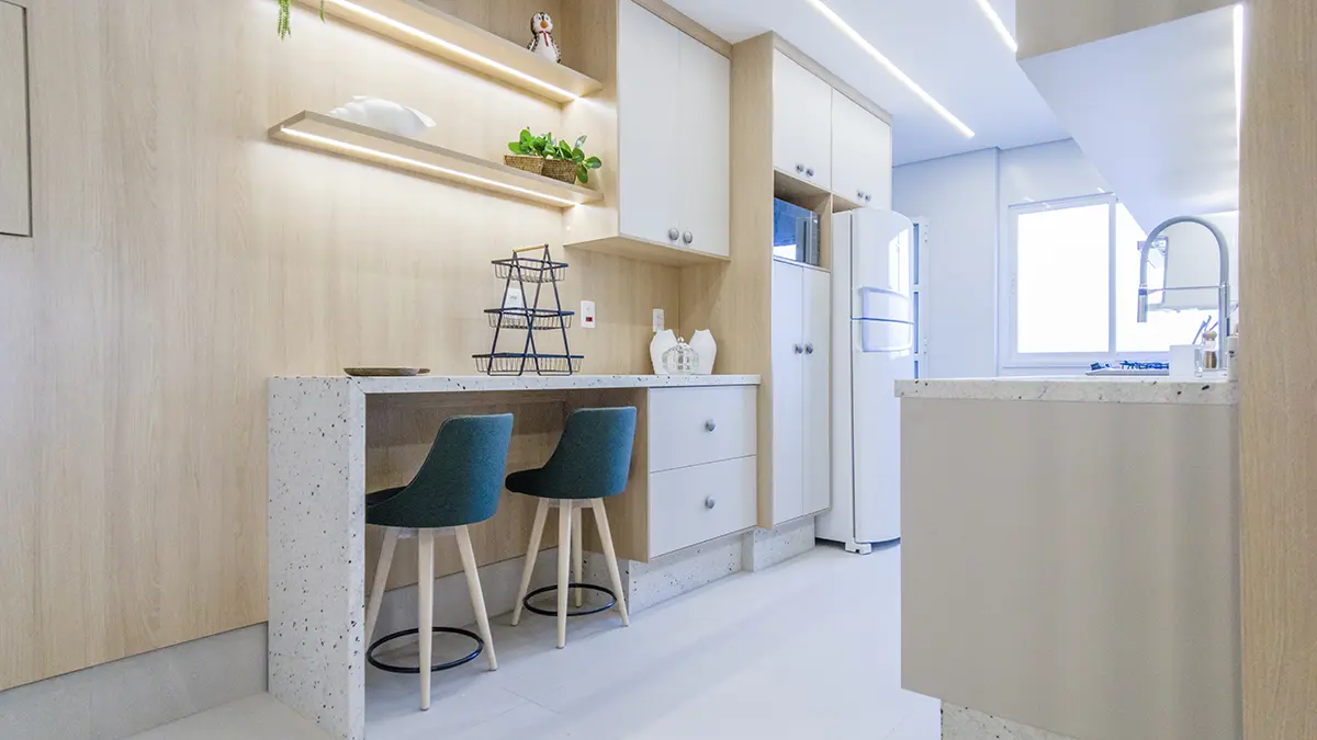 Este projeto nasceu do sonho das sobrinhas, que já tinham a ideia bem definida e me procuraram para transformar o conceito em soluções reais, funcionais e com estética atemporal. Na área social, a composição de cores trouxe elegância para sala de estar e jantar, e para integrar — sem expor — a cozinha, criamos uma divisória em ripas de madeira, garantindo leveza e privacidade visual. Na cozinha, os móveis em tom claro conversam com o mix de revestimentos da rodabanca, e a iluminação geral, com dois perfis de LED, reforça um visual clean.