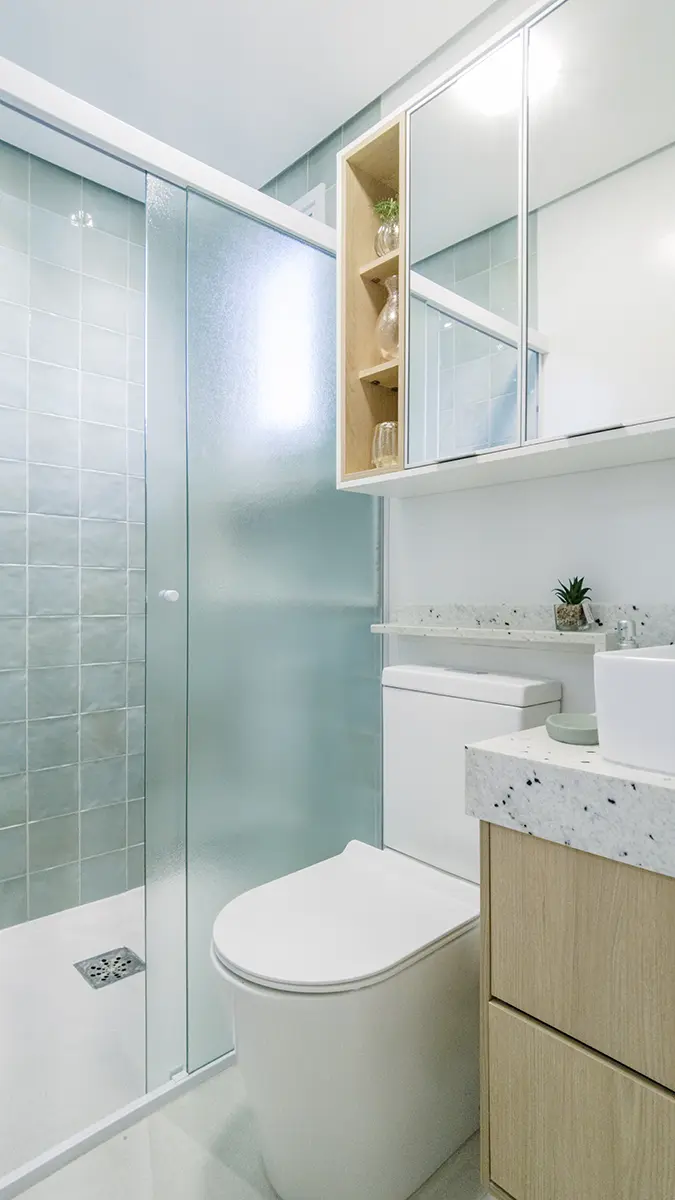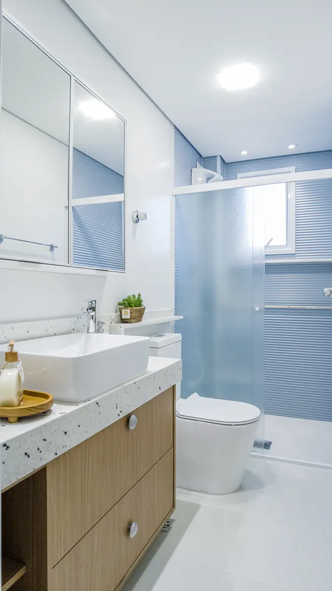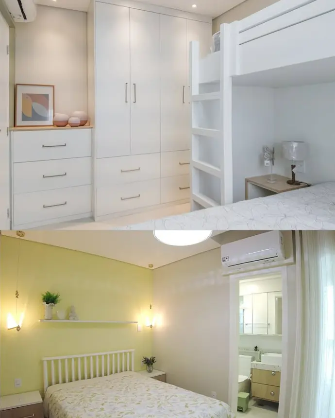 Nos dormitórios, a prioridade foi otimização: quartos de solteiro com beliche e cama de casal, aproveitando cada centímetro. A suíte recebeu um projeto leve e delicado, valorizado por luminárias douradas. O banheiro, em tons claros e madeira média, ganhou personalidade com revestimento azul, mantendo o conjunto delicado e minimalista.