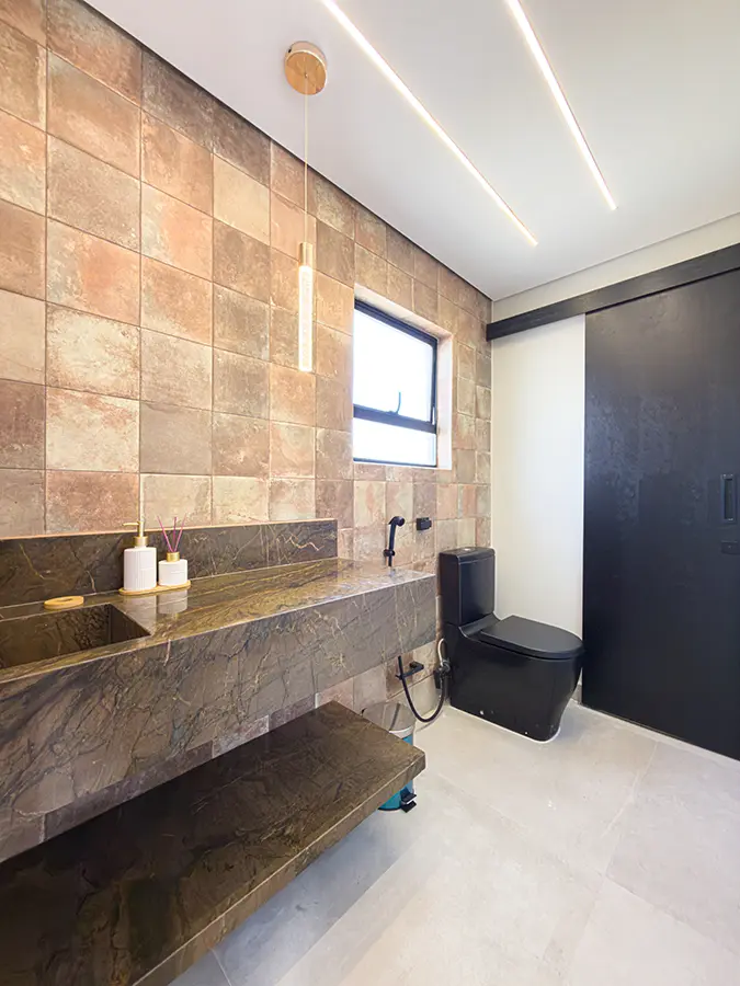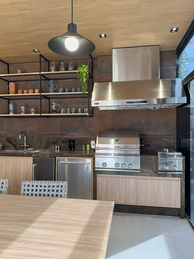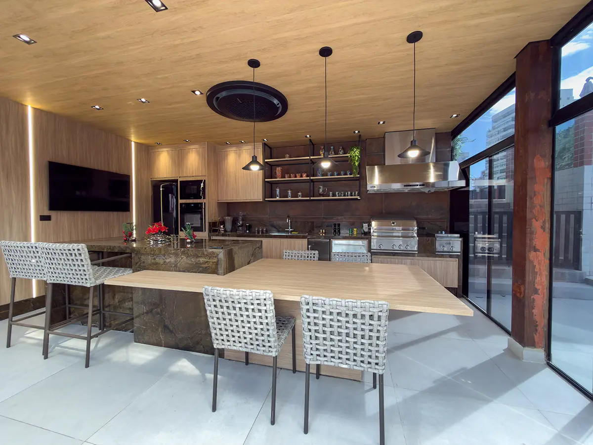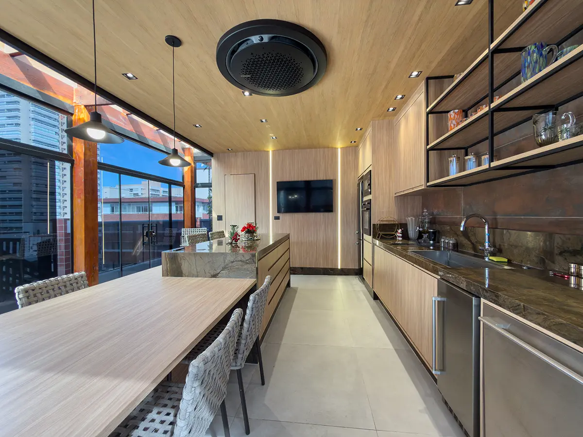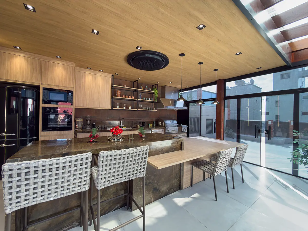 Para garantir conforto em todas as estações, o projeto inclui teto vinílico, ar-condicionado cassete e fechamento em portas de vidro, equilibrando eficiência térmica e leveza visual. No pergolado, a abertura em policarbonato incolor valoriza a entrada de luz natural e evidencia os acabamentos.